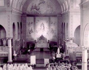 Large murals in the apse and the ceiling, focusing on Mary, Queen of Heaven , were painted in 1933 by Monsignor Charles Maillard of Gravelbourg; eventually peeling and fading, they were painted over during the renovations in 1968. In keeping with the spirit of Vatican Council II, that year also saw the removal of the marble High Altar and communion rails, the creation of an opaque screen made of steel wires and tiny wood blocks, and of a simple altar closer to the congregation.