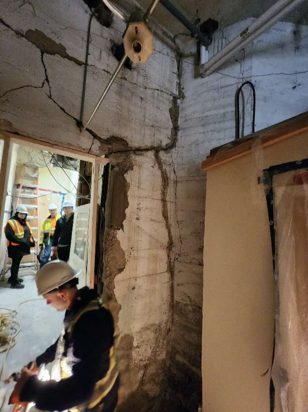 Surprises: When the plaster was removed from the south stair exterior walls and an abutting interior foundation wall, severe cracking was revealed in the interior foundation wall, which helps support the apse of the church. This wall needed replacement prior to the demolition of the south stair. If it had not been discovered, with further deterioration, the cracking could have traveled up through the apse of the church and led to more extensive damage. The decision was made to remove and replace the affected segment of interior foundation wall and the cost of this change will be charged to the budgeted contingency allowance (see: note under construction budget report below).