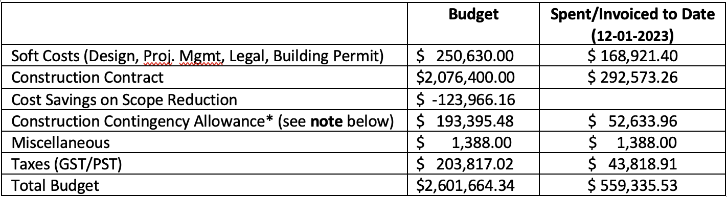 *Note: To date, $127,364.43 of the budgeted construction contingency has been committed. The two largest commitments have been: approximately $55,000 for replacing the water and sanitary lines and approximately $65,000 for replacing the cracked interior foundation wall.