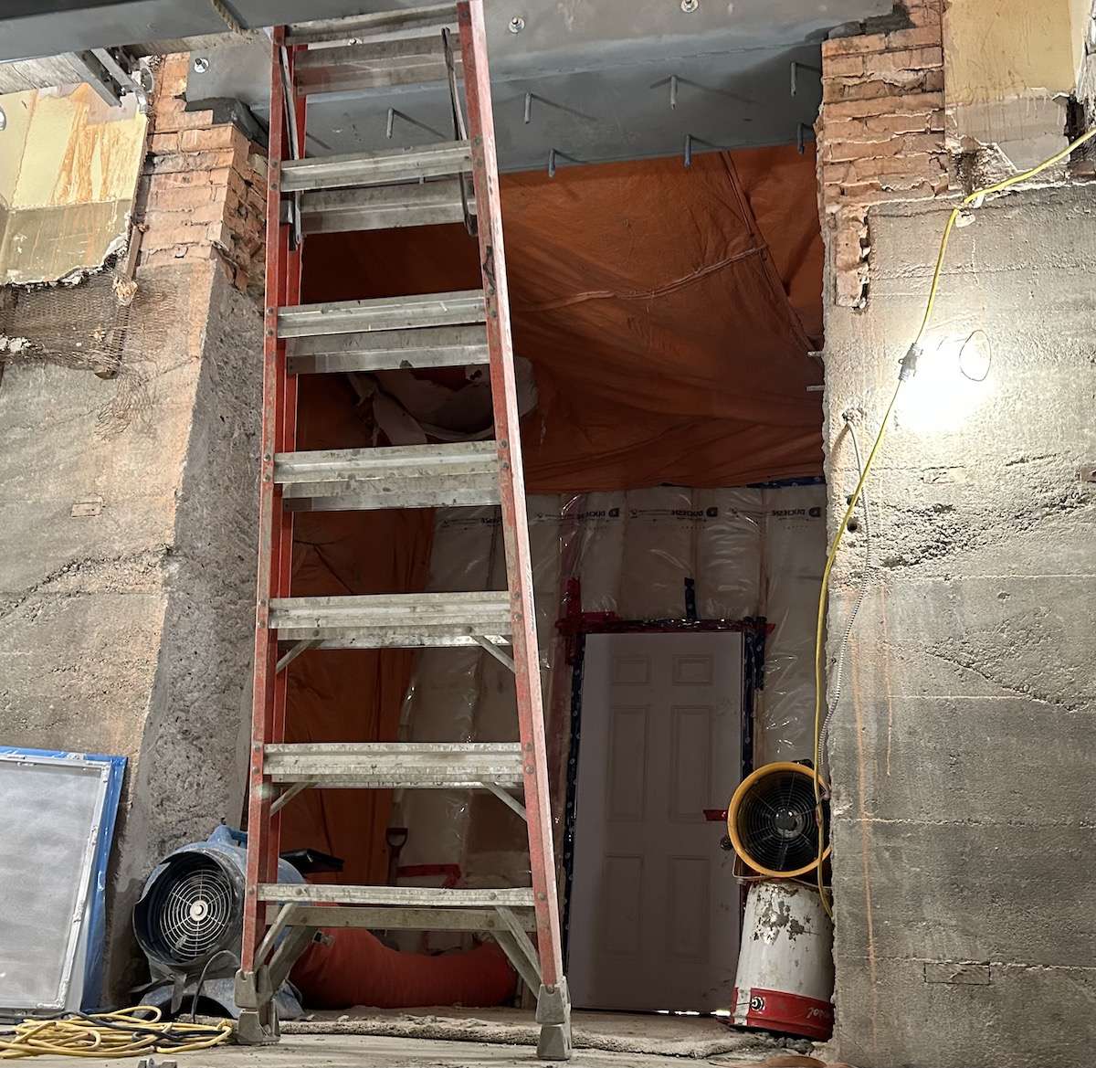 Concrete lintels and columns for the accessible openings into the west tower have been poured, the steel structure and floor for the main level have been constructed, and a steel rail has been built in preparation for the installation of the accessible elevator.